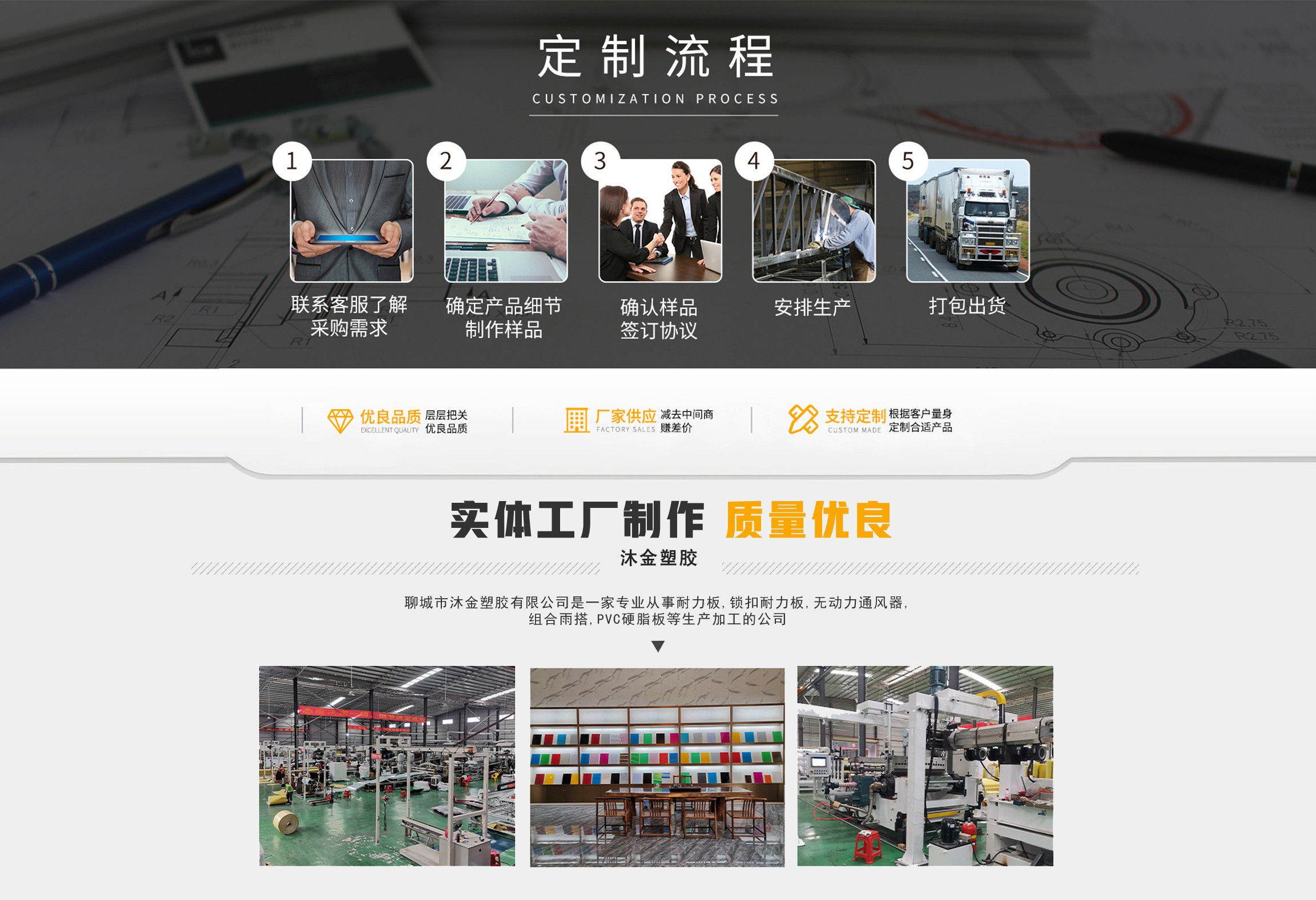 聊城市沐金塑膠有限公司注冊資金2180萬元,占地20000余平方,擁有自建廠房15000平方,員工100余名。10余年來,公司主營耐力板,鎖扣耐力板,耐力板深加工,無動力通風器,組合雨搭,PVC硬脂板,耐力板廠家等板材的發展戰略,逐漸成長為綜合性企業?! 」緭碛卸鄺l板材共擠生產線,采用世界知名品牌進口原材料和先進工藝,依據完善的ISO9001質量管理體系和ISO14001環境管理體系,為產品的卓越品質提供了強有力的保證。憑借過硬的創新能力和堅實的硬件基礎,贏創已成為國內領先的熱塑性板材生產商,產品被廣泛應用于建筑業、農業、工業、廣告業、安防行業及DIY領域。 公司始終致力于通過提供最優的板材應用解決方案,為客戶創造最高的價值;堅守創新、質量、靈活、服務和速度的核心價值觀;堅持“完美的產品需要完美服務的支持”的經營理念,努力實現成為世界領先的板材與解決方案供應商的夢想。 在未來,公司將立足客戶需求,不斷改變和完善現有產品,拓展產品線和充分開發板材的應用領域,為客戶創造全方位的價值。同時更好地實現員工的價值,實現公司團隊的價值。我們將與您一起創贏未來! 企業使命:成為世界領先的板材與解決方案供應商?! 」驹妇埃和ㄟ^提供最優的板材應用解決方案,為客戶創造最高的價值?! 『诵膬r值觀:質量...